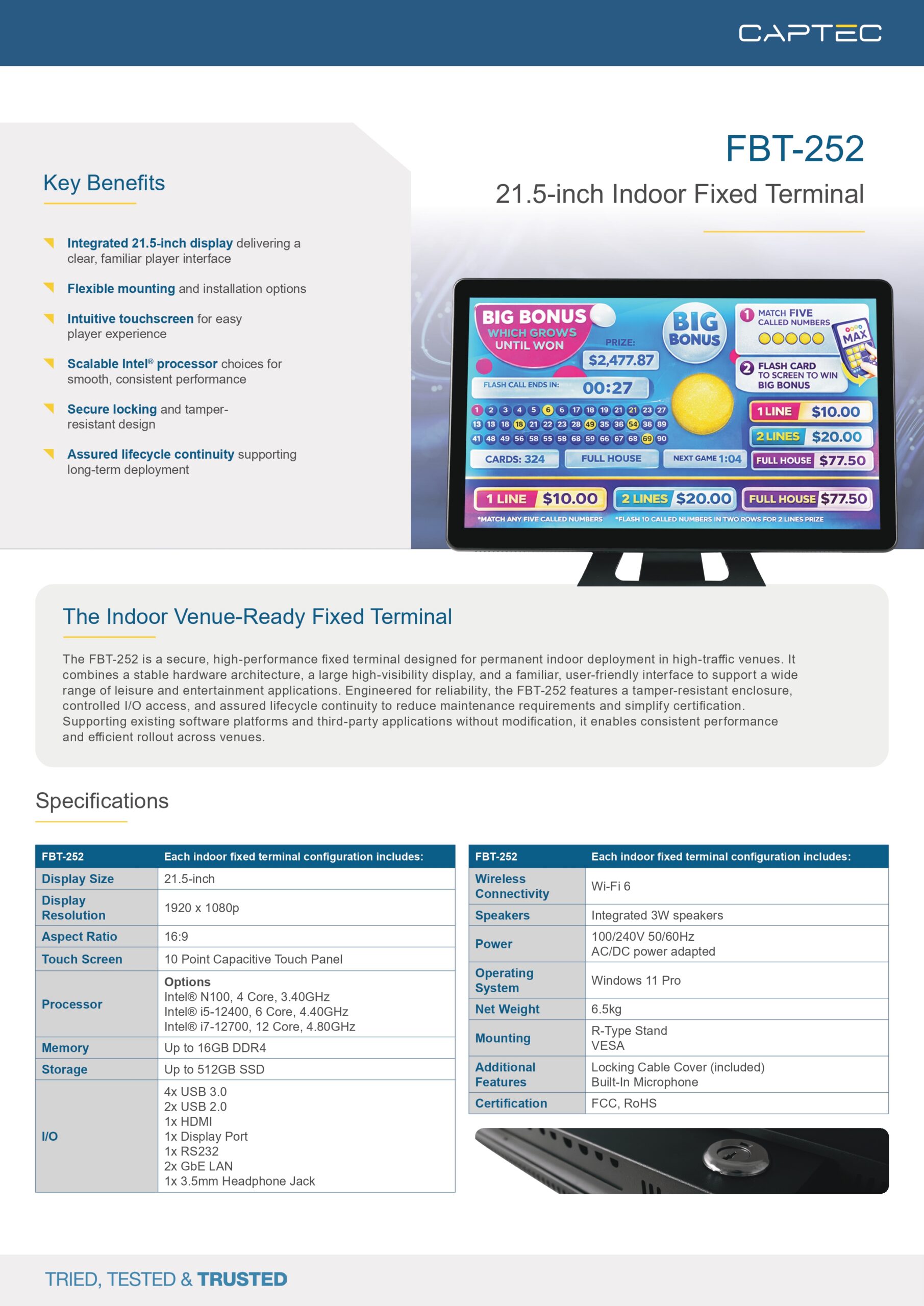 The FBT-252 is a secure, high-performance fixed terminal designed for permanent indoor deployment in high-traffic venues. It combines a stable hardware architecture, a large high-visibility display, and a familiar, user-friendly interface to support a wide range of leisure and entertainment applications. Engineered for reliability, the FBT-252 features a tamper-resistant enclosure, controlled I/O access, and assured lifecycle continuity to reduce maintenance requirements and simplify certification. Supporting existing software platforms and third-party applications without modification, it enables consistent performance and efficient rollout across venues.
