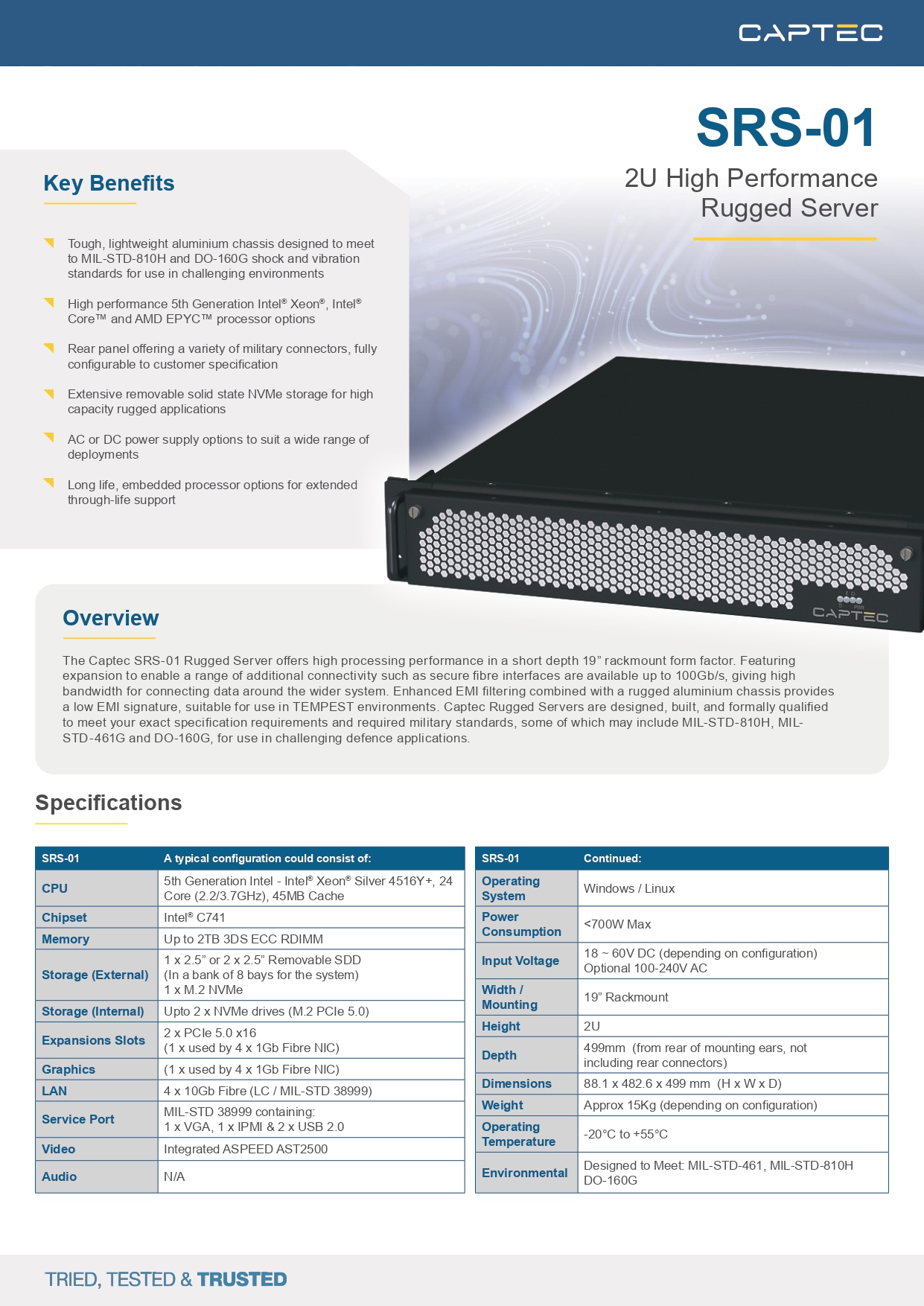 The Captec SRS-01 Rugged Server offers high processing performance in a short-depth 19” rackmount form factor. Featuring expansion to enable a range of additional connectivity such as secure fibre interfaces are available up to 100Gb/s, giving high bandwidth for connecting data around the wider system. Enhanced EMI filtering combined with a rugged aluminium chassis provides a low EMI signature, suitable for use in TEMPEST environments. Captec Rugged Servers are designed, built, and formally qualified to meet your exact specification requirements and required military standards, some of which may include MIL-STD-810H, MILSTD- 461G and DO-160G, for use in challenging defence applications.