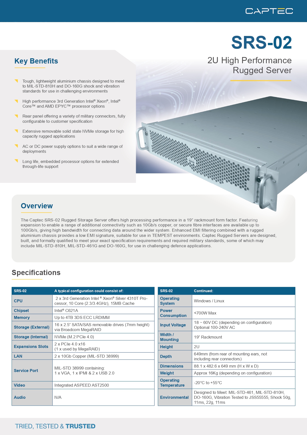 The Captec SRS-02 Rugged Storage Server offers high processing performance in a 19” rackmount form factor. Featuring